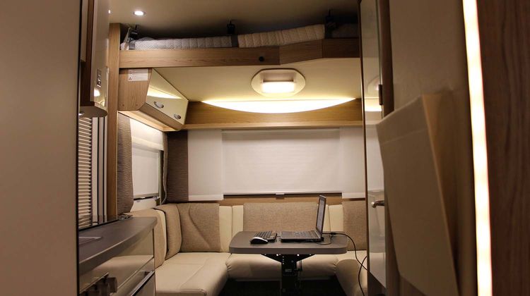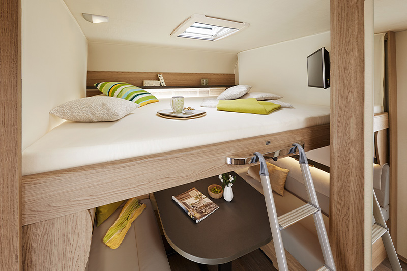 Dazu spendiert Bürstner dem klassischen Caravan mit Einzelbetten und Rundsitzgruppe den erhöhten Aufbau und installiert über der Sitzgruppe ein Hubbett. Wird das Hubbett nicht gebraucht, verschwindet es sogar mit Decken und Kissen kinderleicht unter der Decke und die Sitzgruppe samt Oberschränke macht einen ganz „normalen“ Eindruck.